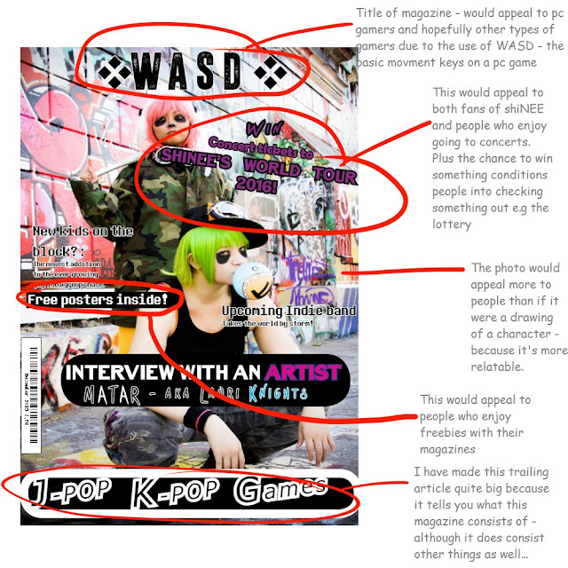 Roughly ages 16-20, I want my magazine to appeal to all genders. They should at least be in education or employment though I don't want to stereotype a group of people and certain people outside the age range, or those who aren't in education or employment might enjoy this magazine. My audience should have an interest in Asian culture and media or an interest in comics, (such as Marvel or DC to name a few) games - I want my magazine to be able to cover a wide variety of games including information on long running games' new releases e.g Pokemon- films and a general interest in music. I want the people who buy this magazine to be able to connect with and share their interests with other people.